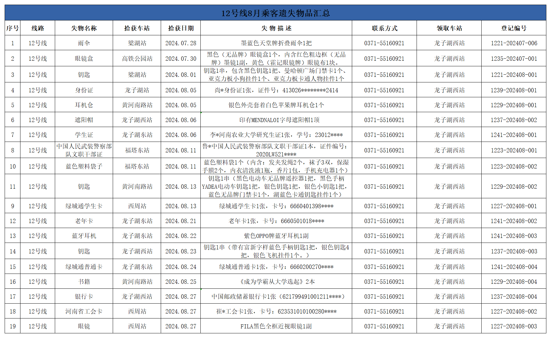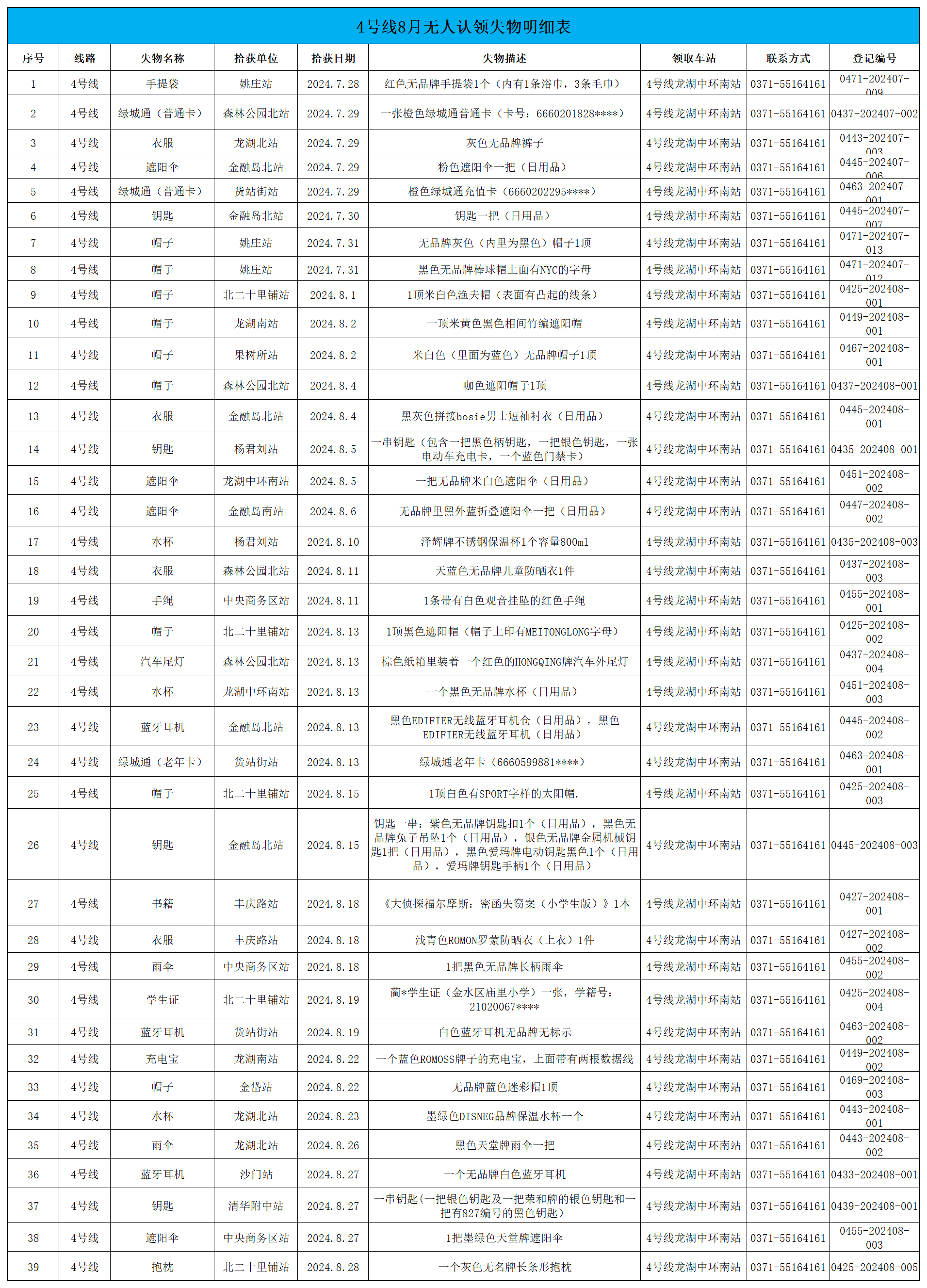 2024年7月28日—2024年8月28日車站無人認領失物情況